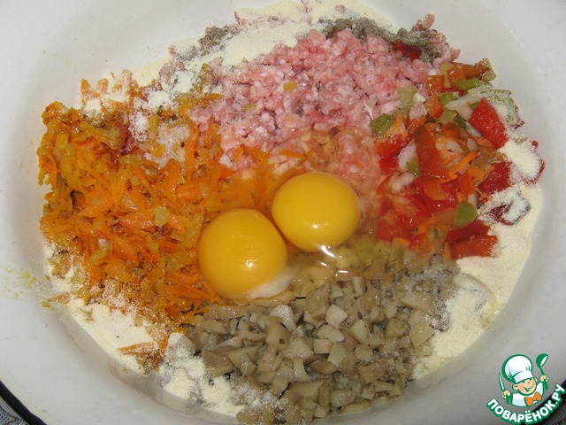 Подготовила болгарский перец (у меня замороженный), кусочек свинины перемолола на мясорубке, нарезала мелким кубиком грибы и лук, морковь натерла на крупной терке.
