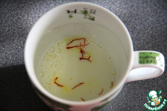 1/2 стакана молока нагреваем в микроволновой печи и кладем 5-6 листочков шафрана.