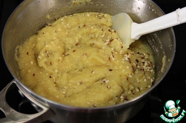 Добавляем чечевичное пюре, кардамон и готовим на самом медленном огне, помешивая, около 30 минут. Очень важно чтобы огонь был минимальный. Тогда чечевица равномерно приготовится, впитаем гхи и будет нежной структуры.