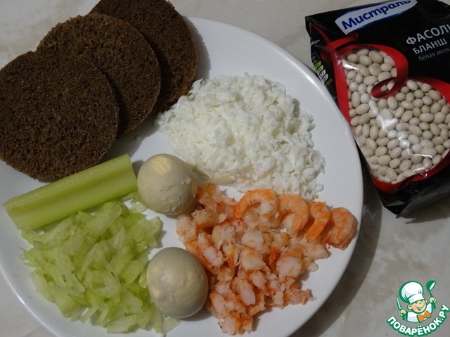 На обжаренный крутон установить съемную порционную форму для салата. Укладываем все слоями: 1 - фасоль со сливочным сыром, 2 -сельдерей, 3 - белок, 4 - креветки, 5 - желток. Форму снять. Украсить сверху креветками и сельдереем, положить сердечко из красного сладкого перца и листочки петрушки.