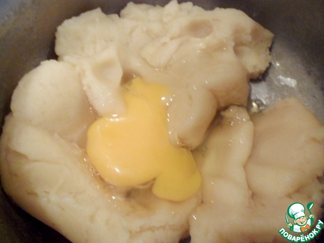 Добавить муку и, постоянно помешивая, проварить на медленном огне тесто 3-4 минуты. Остудить, добавить по одному яйца, каждый раз тщательно вымешивая в однородную массу.