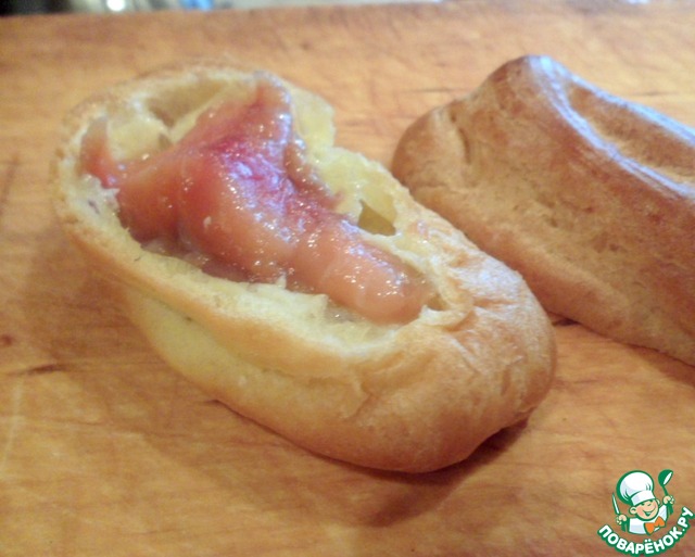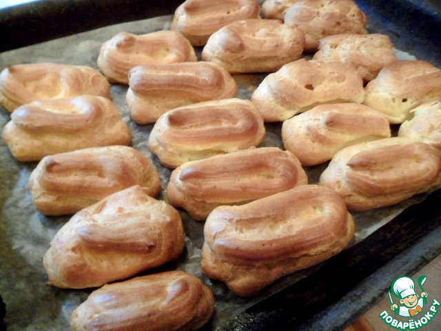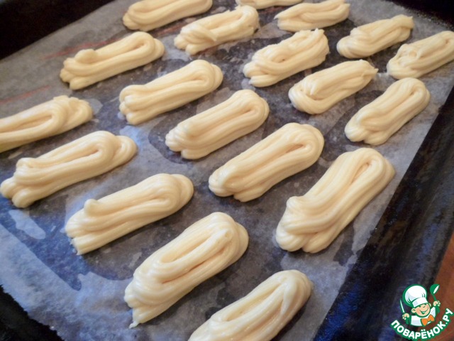 Выложить тесто на пергамент в виде небольших эклерчиков. У меня получилось 20 штук.