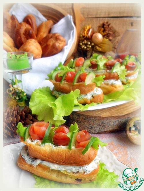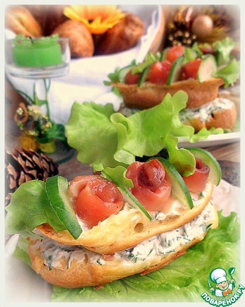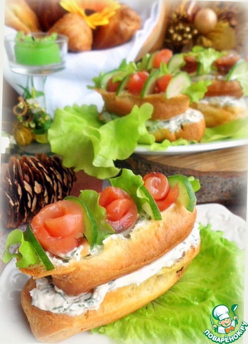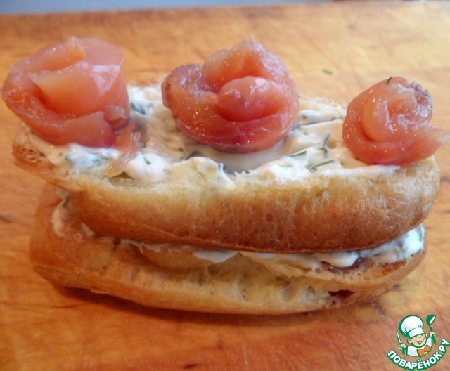 Углубление верхней части эклера также смазать сыром и выложить лодочкой поверх нижней части. Украсить свернутыми из форели розочками.