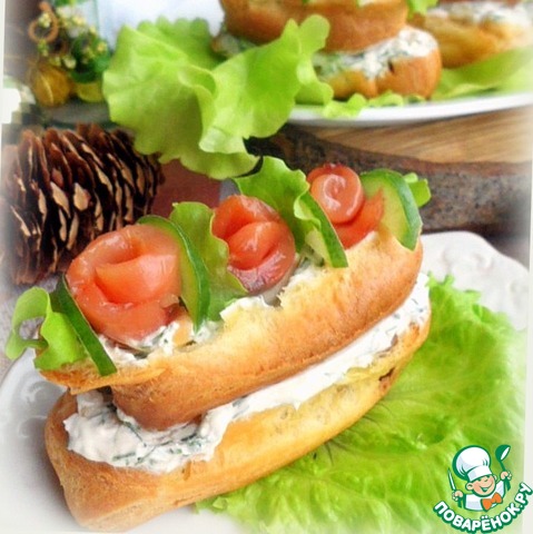 Разрезать эклер вдоль на 2 части. На нижнюю часть выложить кусочек форели, на нее смешанный с мелко нарезанным укропом творожный сыр.