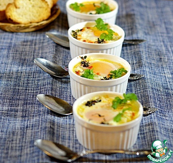 Поставьте формочки на противне в духовку, нагретую до 190 гр. С на 10-15 мин и запекайте, чтобы белок свернулся, а желток остался мягким.