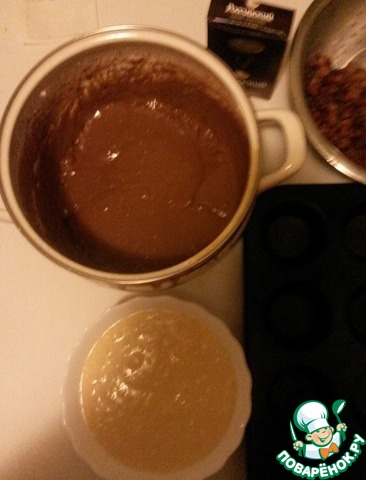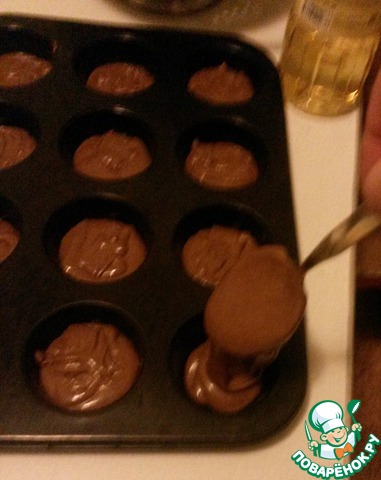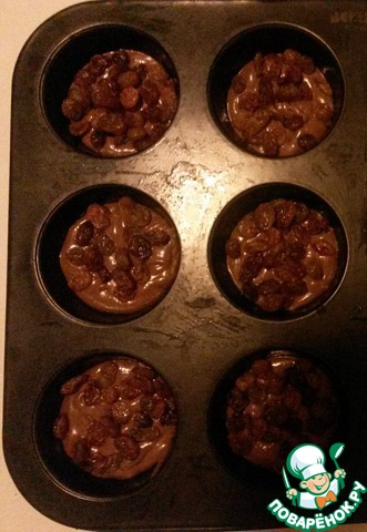 Форму для выпечки смазываем маслом и столовой ложкой наливаем сначала шоколадное тесто в каждую формочку. Когда все формочки заполнили, посыпаем изюмом, можно и побольше (можно дольку шоколада еще добавить).