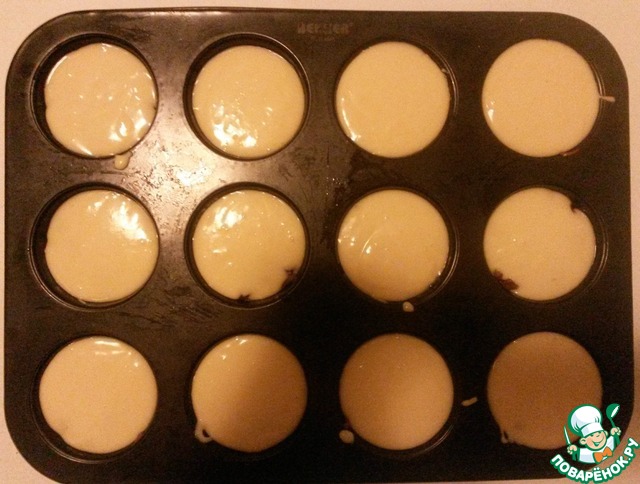 Теперь заполняем белым тестом. Кстати, тесто не должно быть сильно густым! По консистенции оно должно быть, как 15 процентная сметана, то есть с ложки, оно должно плавно стекать, а не течь или сползать комком.