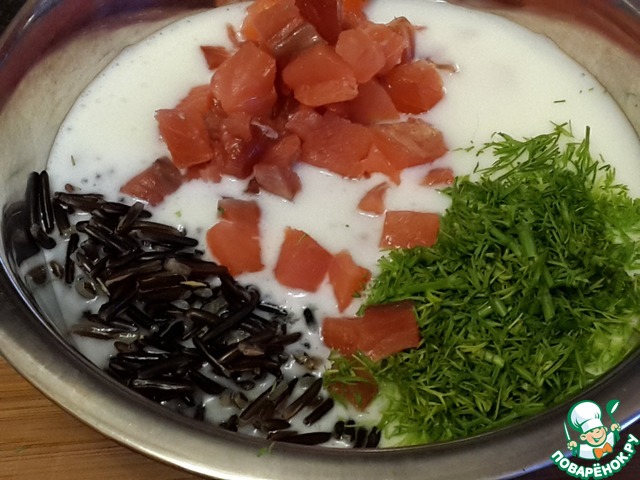 К йогурту добавьте Отваренный рис, нарезанную кубиками копченую форель и нарубленный укроп, приправьте солью по вкусу