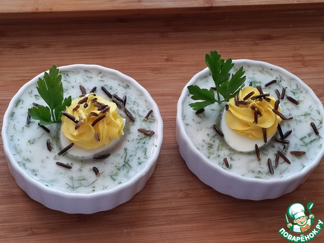 Застывшее заливное выньте из холодильника. При помощи кондитерского мешка нафаршируйте яичные белки желтковым муссом, украсьте на свой вкус