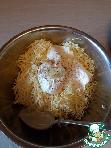 Натрите плавленный сыр, смешайте его с грибами, измельченным чесноком и майонезом, приправьте черным перцем