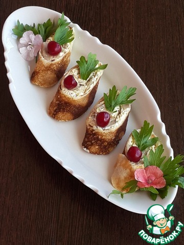 | Хорошая закуска для праздничного застолья - рулетики из блинчиков с начинкой из сыра и грибов! |