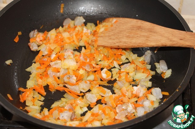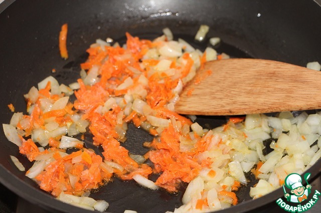 Обжарить на растительном масле лук, нарезанный кубиками, с морковью, натертой на терке. Овощи готовить 5-7 минут.