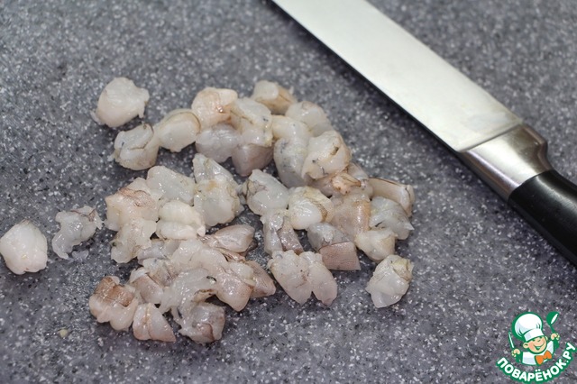 Пока овощи обжариваются, креветки почистить, удалить темную кишечную вену, нарезать кусочками.