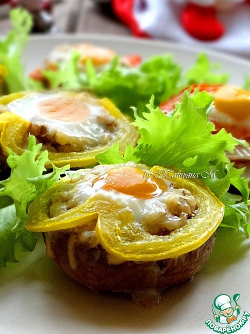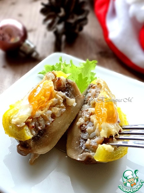 | Шампиньоны, фаршированные гречкой с чесночным ароматом, разноцветными "юбочками" из болгарского перца и перепелиными яйцами - красочная и вкусная порционная закуска для праздничного стола! |
