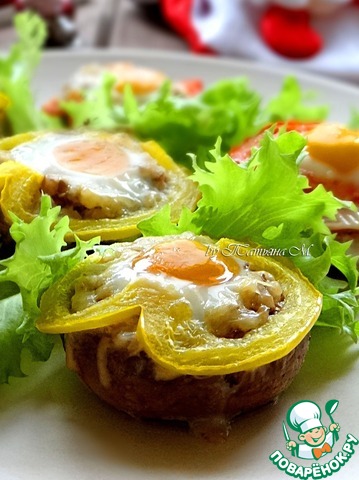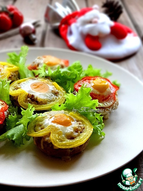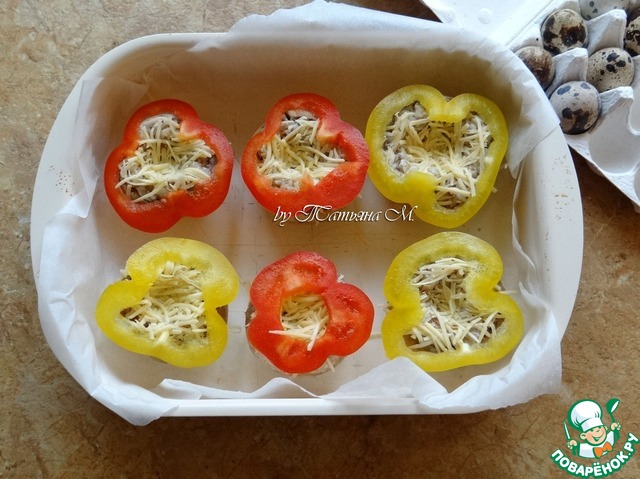 Посыпать тертым сыром, затем выложить сверху перец болгарский, нарезанный кружочками, полыми внутри;