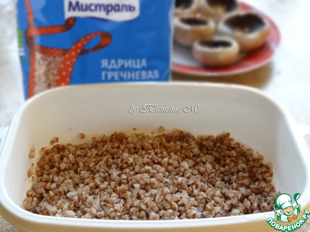 Гречку смешать с обжаренными грибами, добавить мелко-рубленный чеснок, подсолить, заправить сметаной;