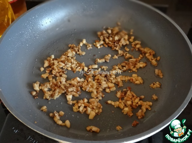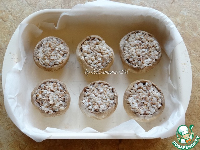 Шампиньоны выложить на пергамент в жаропрочную форму и нафаршировать начинкой;