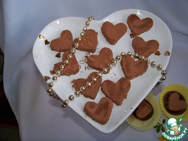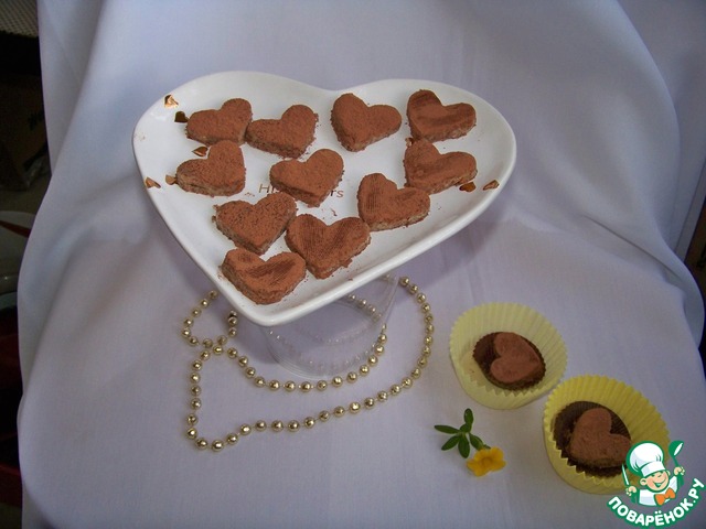 Готовые сердечки выложить на тарелку и посыпать какао-порошком. Готовые сердечки поставить в холодильник минут на 20. При желании сердечки можно покрыть шоколадной глазурью, это на Ваше усмотрение. Мне же нравится вариант с посыпкой какао.