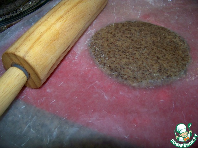 Охлаждённое тесто (колобок) раскатать в 0,5 см. толщиной на слегка подпыленном мукой столе, лучше раскатывать с помощью пищевой бумаги.