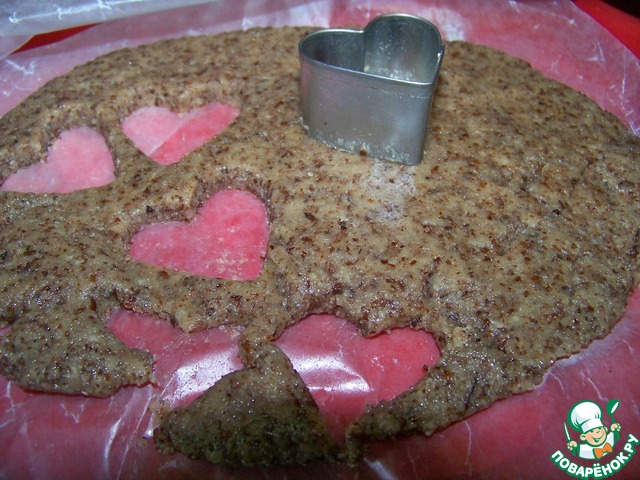 Вырезать формочкой сердечки. Оставшуюся массу вновь скатать в колобок и снова раскатать толщиной в 0,5 см. Продолжить вырезание сердечек.