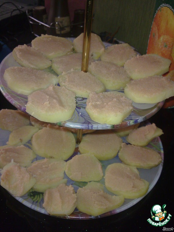 Отваренный картофель очищаем и режем кружочками,