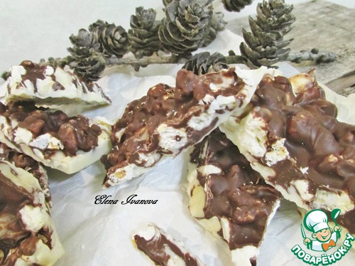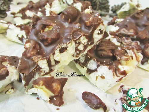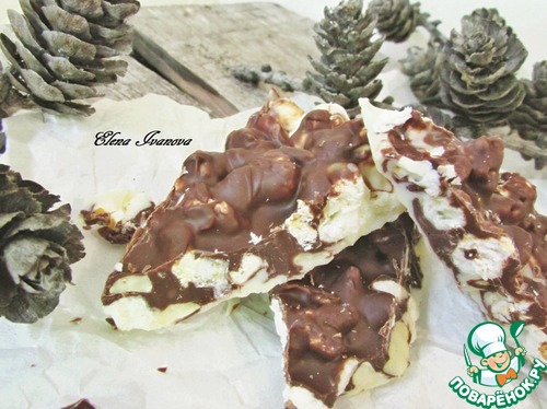 Сверху орехов вылить молочный шоколад. По желании при помощи зубочистки сделать мраморные разводы. Поставить форму в холодильник и дать шоколаду застыть.