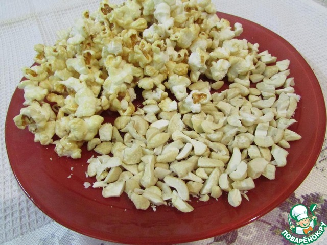 Подготовить попкорн и орехи. Кешью слегка прокалить на сковороде. Крупные кусочки разрезать пополам.