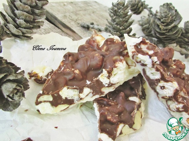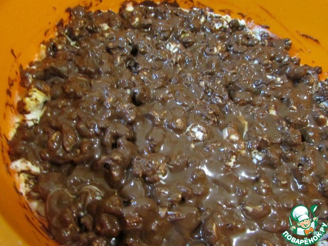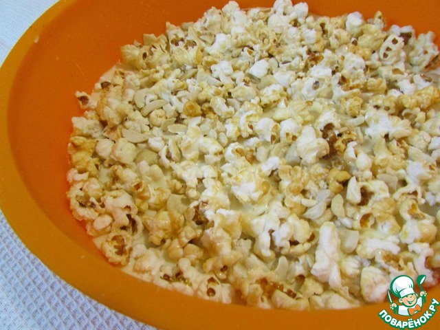 Сразу же выложить на него попкорн и кешью. Слегка придавить, чтобы шоколад и ореховая смесь соединились.
