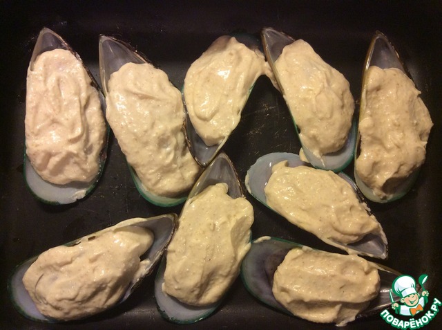 Аккуратно чайной ложкой выкладываем соус поверх мидий, стараясь покрыть их мякоть полностью, и отправляем в разогретую до 200°С духовку на 15 минут. Ориентируйтесь по своей духовке, нужно чтобы соус на мидиях приобрел легкий золотистый оттенок.