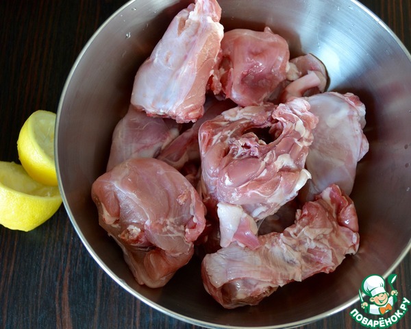 Подготовить кролика. Для приготовления этого блюда желательно взять молодого кролика, общим весом не более 2 кг. Тушку кролика промыть и нарезать на куски примерно одинакового размера. Сбрызнуть соком одного лимона и оставить в миске на пару часов.