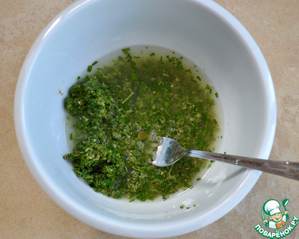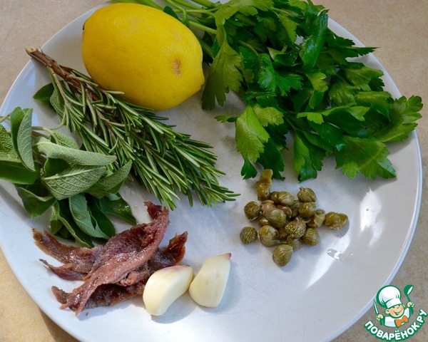 В чашу блендера положить филе анчоусов, каперсы, два зубчика чеснока и ароматические травки (оставить несколько листиков шалфея и розмарина). Измельчить всё до состояния "кашицы".