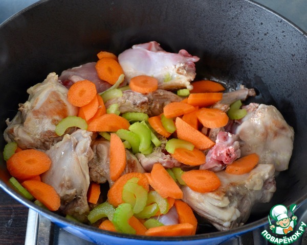 Морковь и стебель сельдерея вымыть и нарезать кусочками...