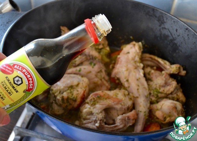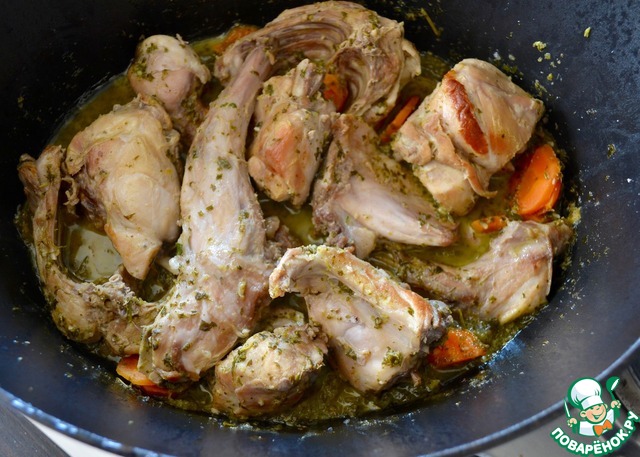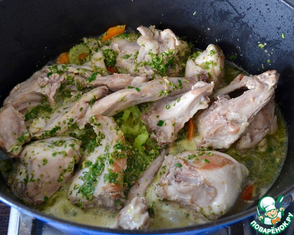 Выложить в кастрюлю песто и продолжить готовить кролика еще 40-45 минут на слабом огне. Время от времени переворачивайте куски мяса, и если соус будет испаряться, добавить еще немного вина или бульона (совсем немного, по вкусу).