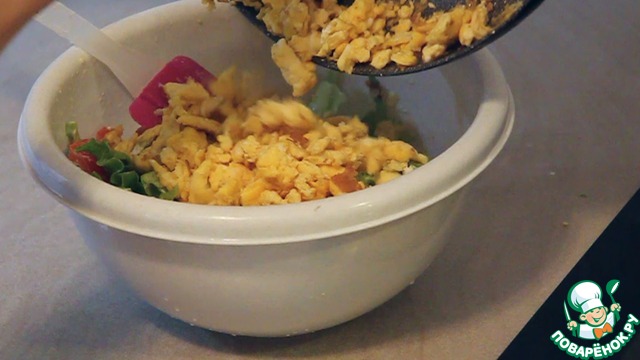 В ходе приготовления – омлет активно перемешиваем. Так как нам для нашего салата понадобятся воздушные кусочки получившегося омлета.