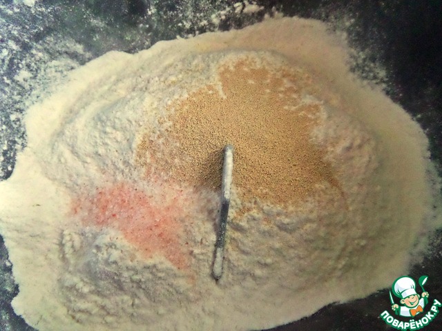Опять доверим замесить тесто хлебопечке. Всыпаем в чашу муку, дрожжи, соль.