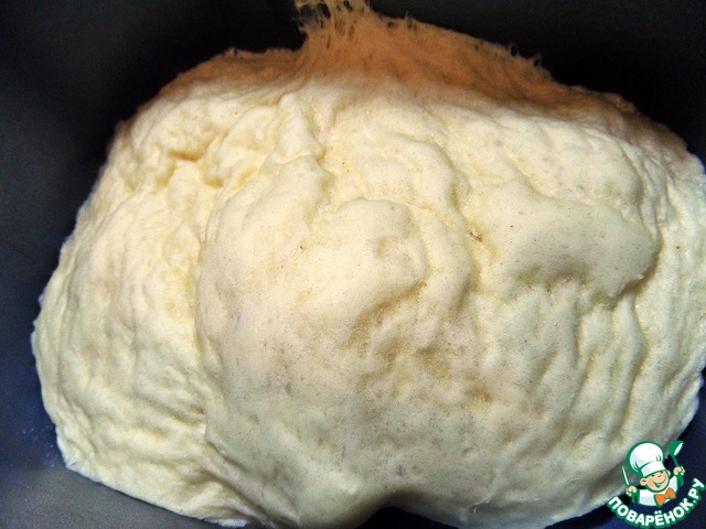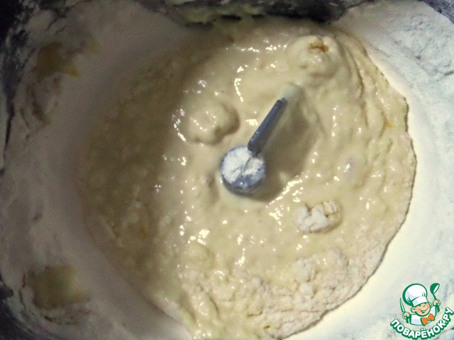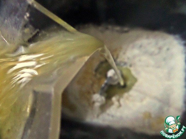Вливаем жидкий состав в сухой. Включаем хлебопечку на программу "замес теста" 1 ч. 30 мин.