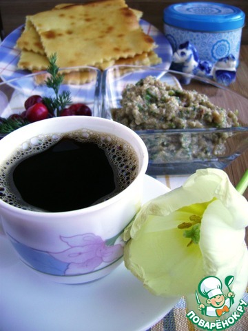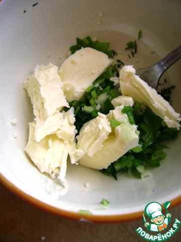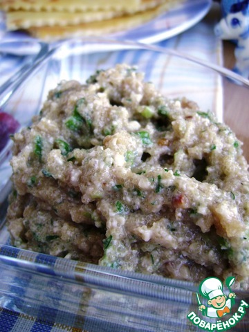 Пока блины пекутся, приготовить икорное масло. Растереть сливочное масло с мелкорубленной зеленью и горчицей. Добавить измельченые грецкие орехи и натертое на мелкой терке кислое яблоко. Хорошо перемешать.
