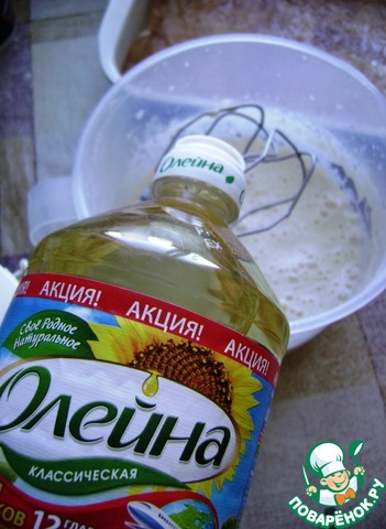 Муку просеять дважды. Влить в высокую кружку от миксера молоко, добавить желтки, соль и сахар, размешать миксером на высокой скорости. Всыпать понемногу муку и размешивать ее миксером на средних оборотах. Влить масло «Олейна». Взбить белки в пену и аккуратно на малых оборотах вмешать их в тесто.
