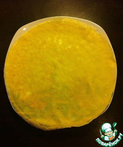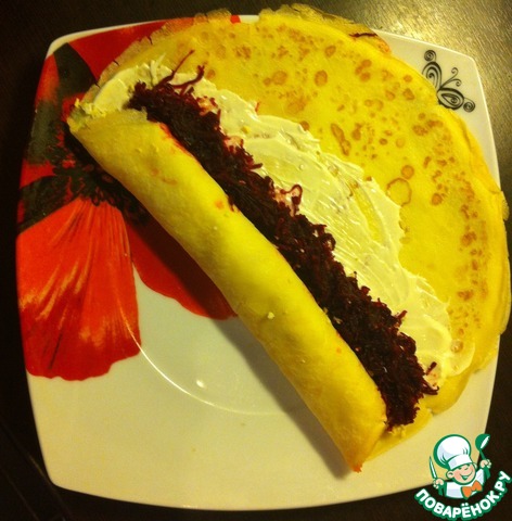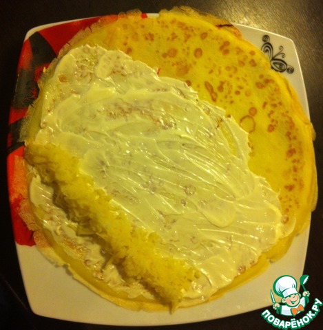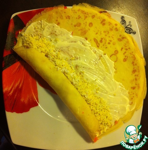 Готовый блинчик слегка смазываем майонезом (если любите майонез – смазывайте щедро) и начинаем выкладывать нашу начинку.