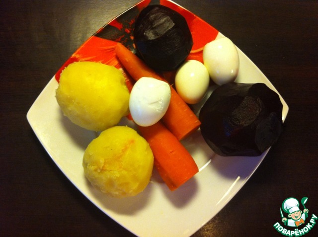Для начинки свеклу, картофель, морковь отварить до готовности. 3 яйца сварить вкрутую. Всё очистить.