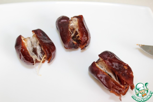 В каждом финике сделать продольный разрез и удалить косточку. Внутрь финика капнуть немного соуса, положить дольку чеснока и кусочек моцареллы.