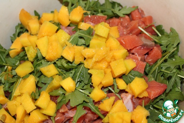 Рыбу порезать небольшими кусочками. Манго и авокадо почистить и порезать. Листья рукколы порвать пополам.