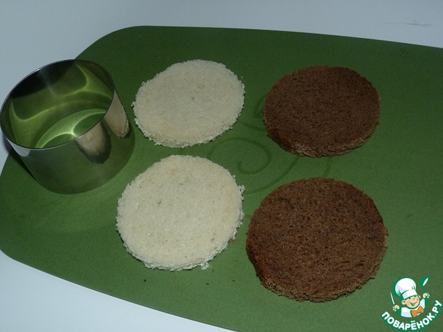 Из хлеба с помощью специальной выемки (или сервировочного кольца) вырезать "шайбочки".