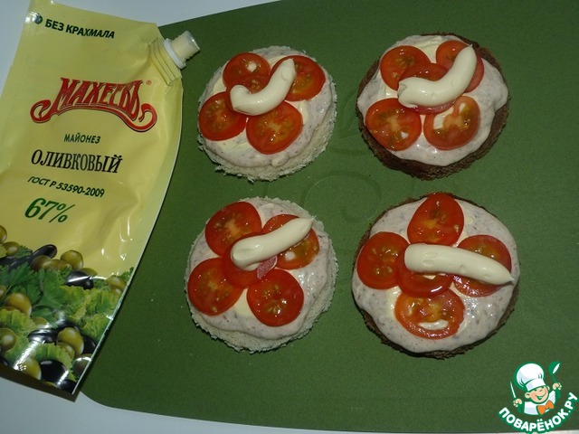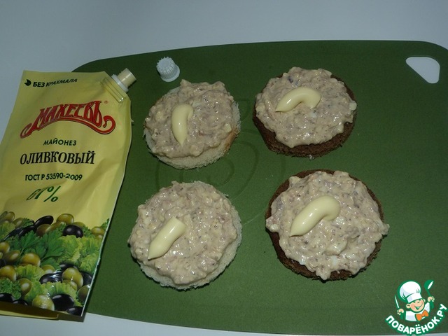 Сначала на хлеб намазать смесь из сардины с сыром и яйцами. Сверху нанести майонез (я люблю "оливковый", Вы можете использовать другой - на свой вкус).