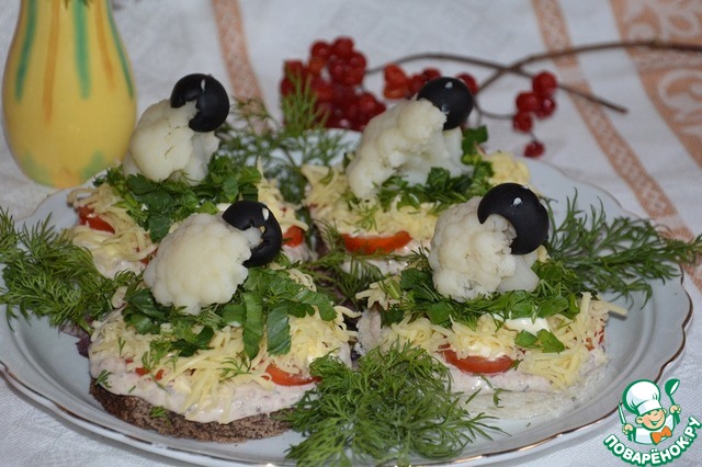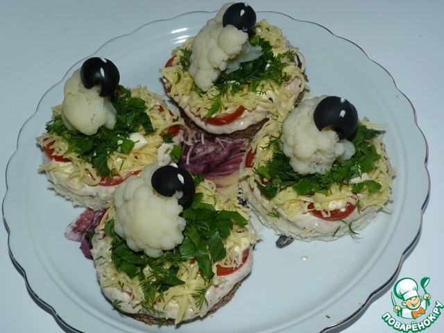 | Вчера в газетном киоске пролистала одну из кулинарных брошюр, и увидела там оформление салата "овечками" из цветной капусты. А, как Вы знаете, овечка - это символ будущего года. Идея мне понравилась, решила потренироваться)) Но приготовила не салат (салат там был слишком банальный - помидоры и твердый сыр), а закуску-бутерброды. Конечно же и в моей закуске-бутербродах нового ничего нет. Но, надеюсь, что кому-либо такой вариант понравится. |