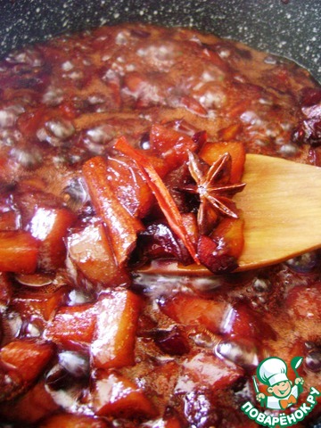 При желании добавить немного перца чили –я положила несколько сушеных полосочек. Влить вино и выпарить его почти полностью, постоянно помешивая. Слива должна стать полупрозрачной и достаточно мягкой.