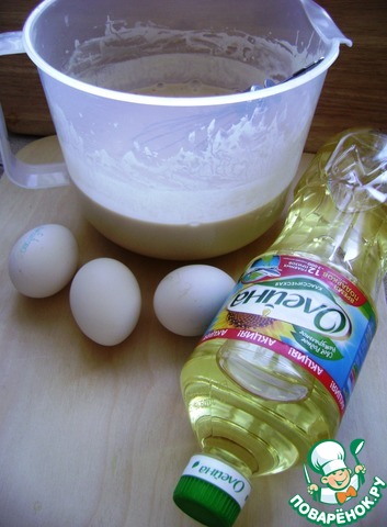 Яйца взбить с сахаром в пышную пену. Продолжая взбивать, тонкой струйкой влить 2 ложки масла «Олейна». Получившийся крем аккуратно смешать с тестом. Добавить щепотку соды, погашенной 50 мл кипятка и размешать тесто осторожно.