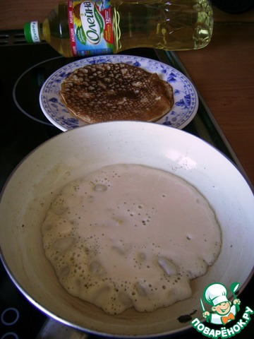 Выпекать блины на небольшой сковороде, изредка подмазывая ее маслом «Олейна».
