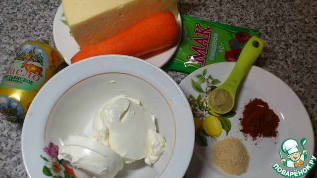 Сыр натереть на мелкой терке, добавить масло, сливочный сыр, горчицу, паприку и чеснок. Можно сразу все измельчить в комбайне.