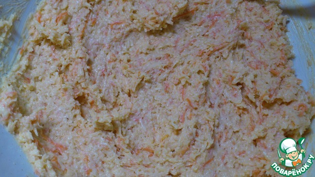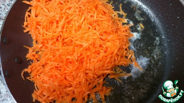На сковороде растопить столовую ложку масла. Морковь натереть на мелкой терке, припустить в масле на маленьком огне до мягкости.